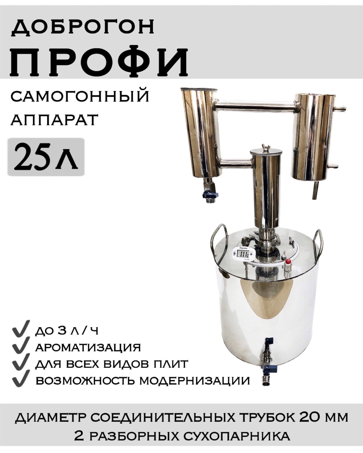 · Наличие двух сухопарников сделает продукт перегонки максимально чистым (т.к. аппарат работает по принципу двойной очистки) и полностью предотвратит попадание сивушных масел в продукт перегона.