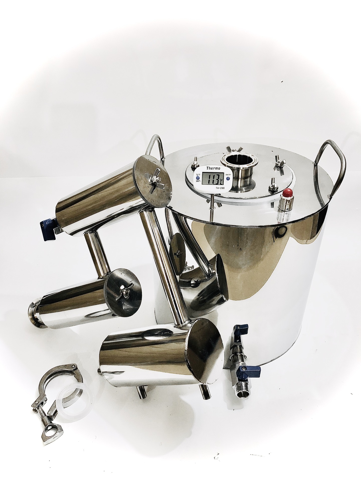 Готовый для перегонки аппарат высокой производительности до 3л/ч, с двумя разборными сухопарниками и вертикальным охладителем.