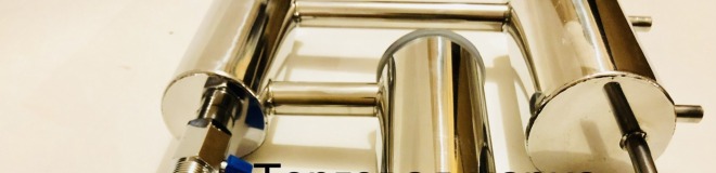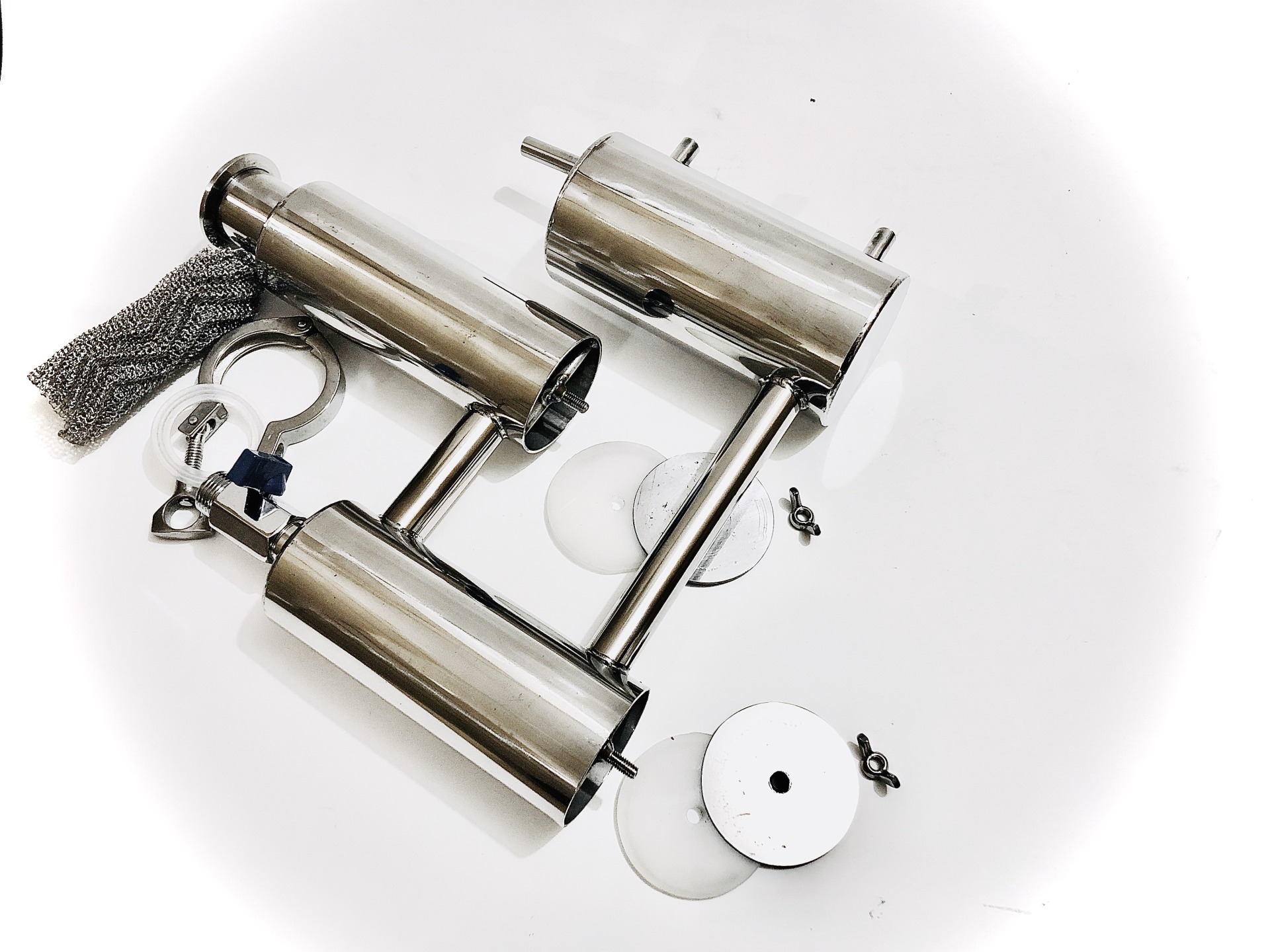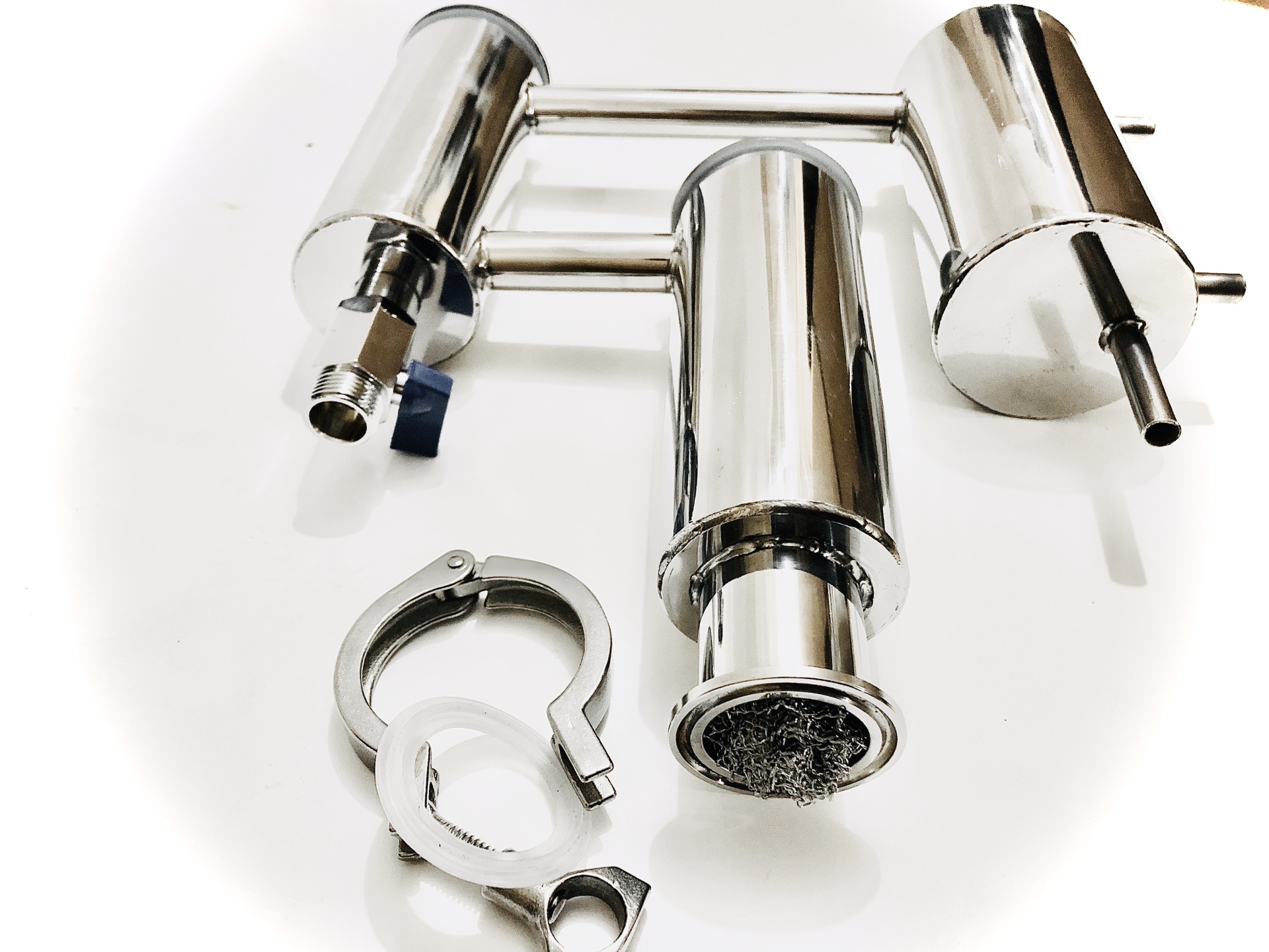 Готовый для перегонки аппарат высокой производительности до 3л/ч, с двумя разборными сухопарниками и вертикальным охладителем под кламп 1.5дюйма(38мм).