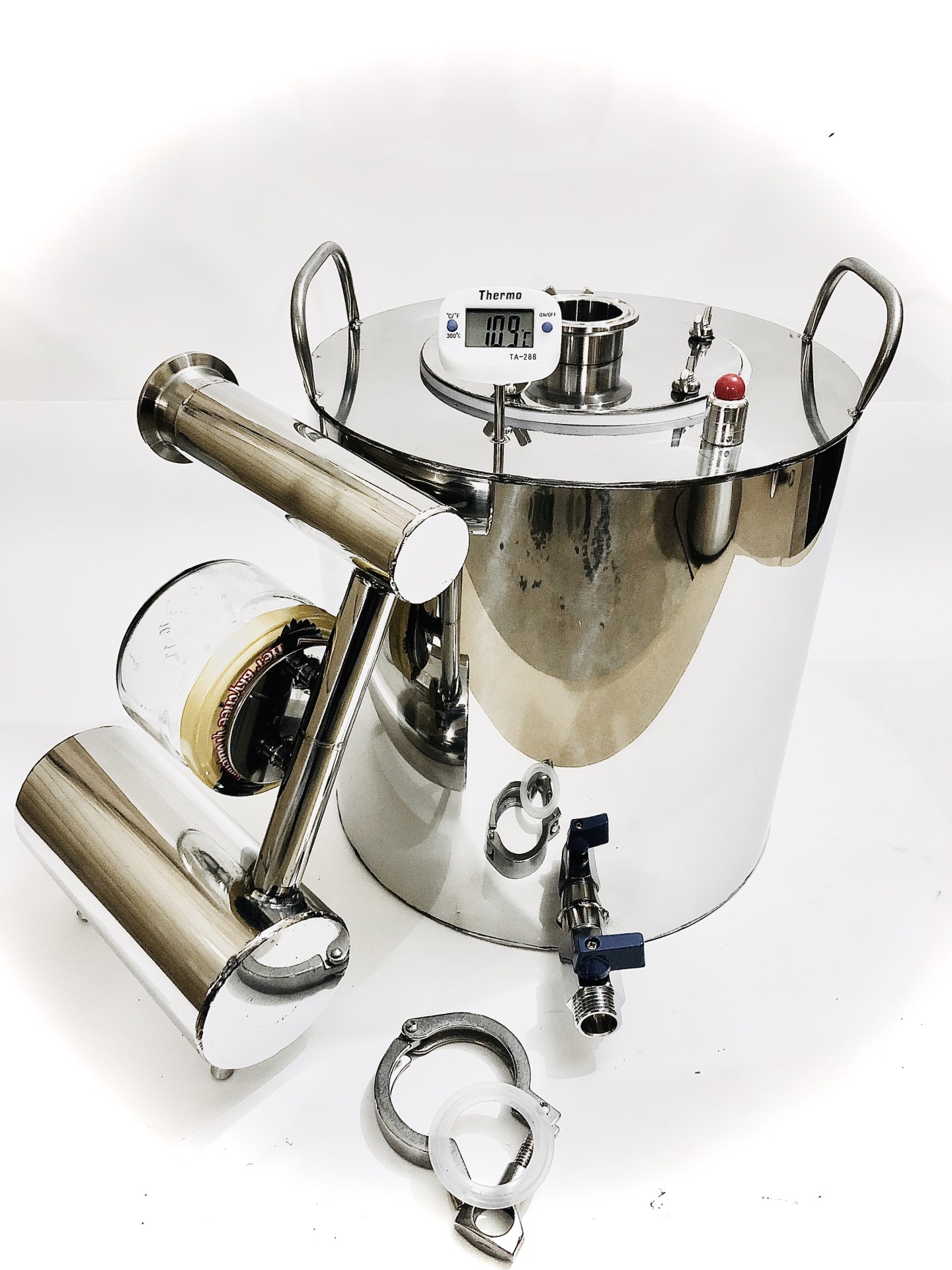 Готовый для перегонки аппарат 20л высокой производительности до 2,5л/ч с разборным сухопарником (банкой) и вертикальным охладителем.