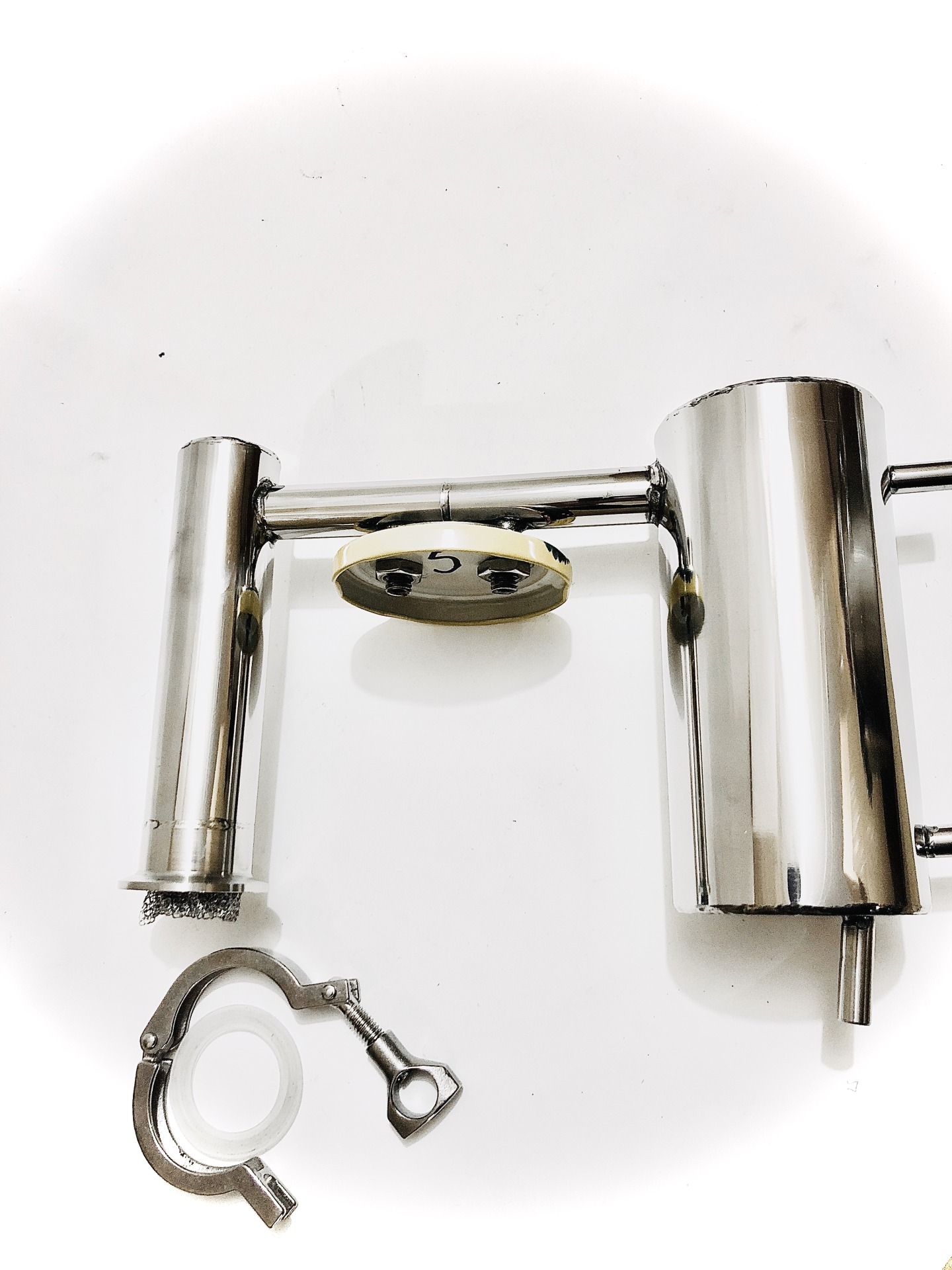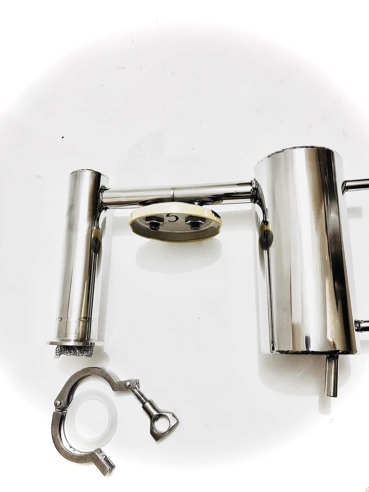 Готовый для перегонки аппарат высокой производительности до 2,5л/ч с разборным сухопарником (банкой) и вертикальным охладителем.
