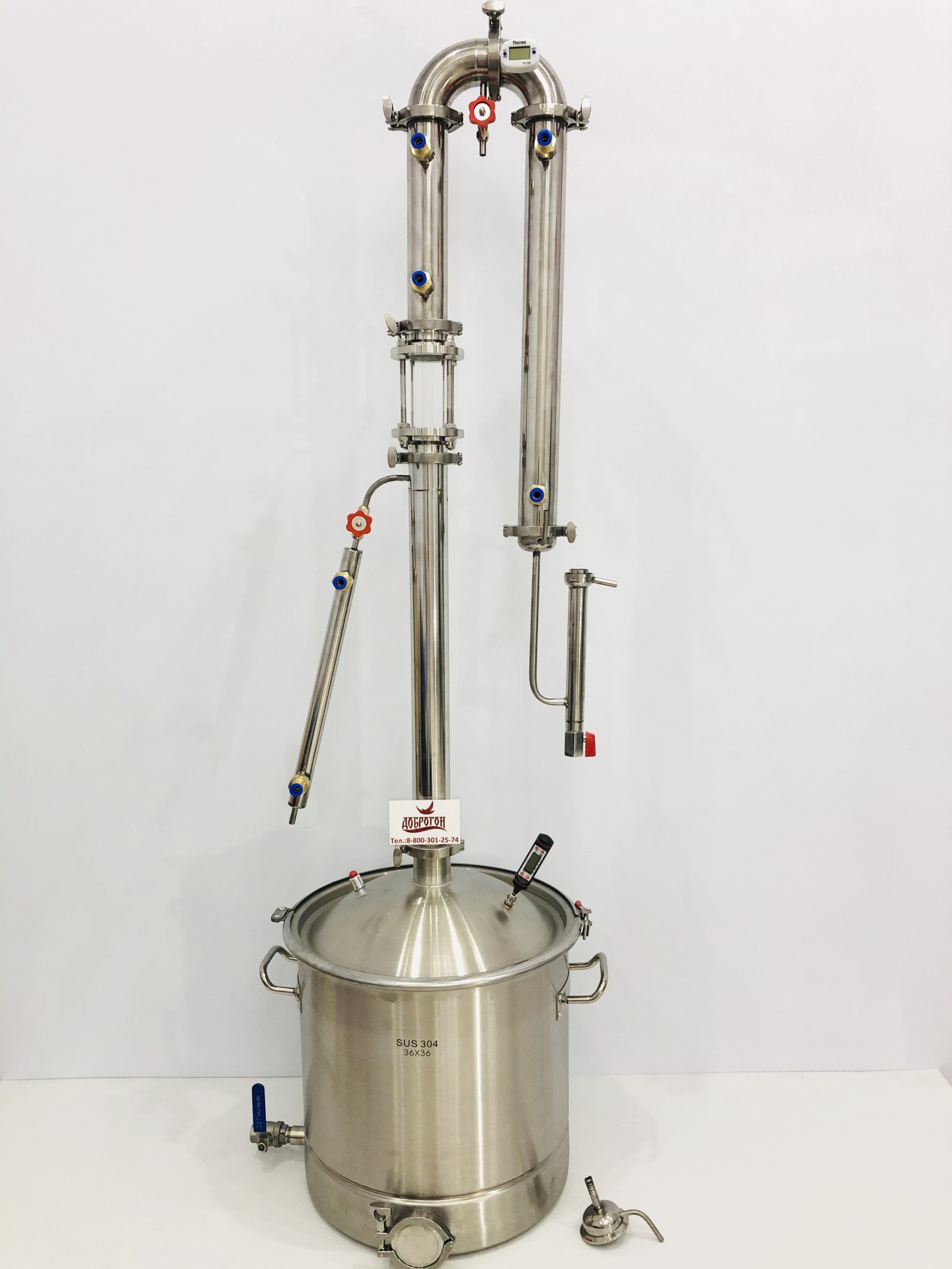 Перегонный куб - изготовлен из пищевой нержавеющей стали 304 марки. Имеет клапан избыточного давления, гильзу под электронный термометр и выход под кламповое соединение "2". В нижней части куба установлен кран для слива. Куб с прокаткой под фальш дно и врезкой под термометр. Толстое ферромагнитное дно 5мм с алюминиевой капсулой обеспечивает равномерный нагрев продукта и исключает пригорание. Быстросъемный обруч и силиконовая прокладка обеспечивают полную герметизацию куба.