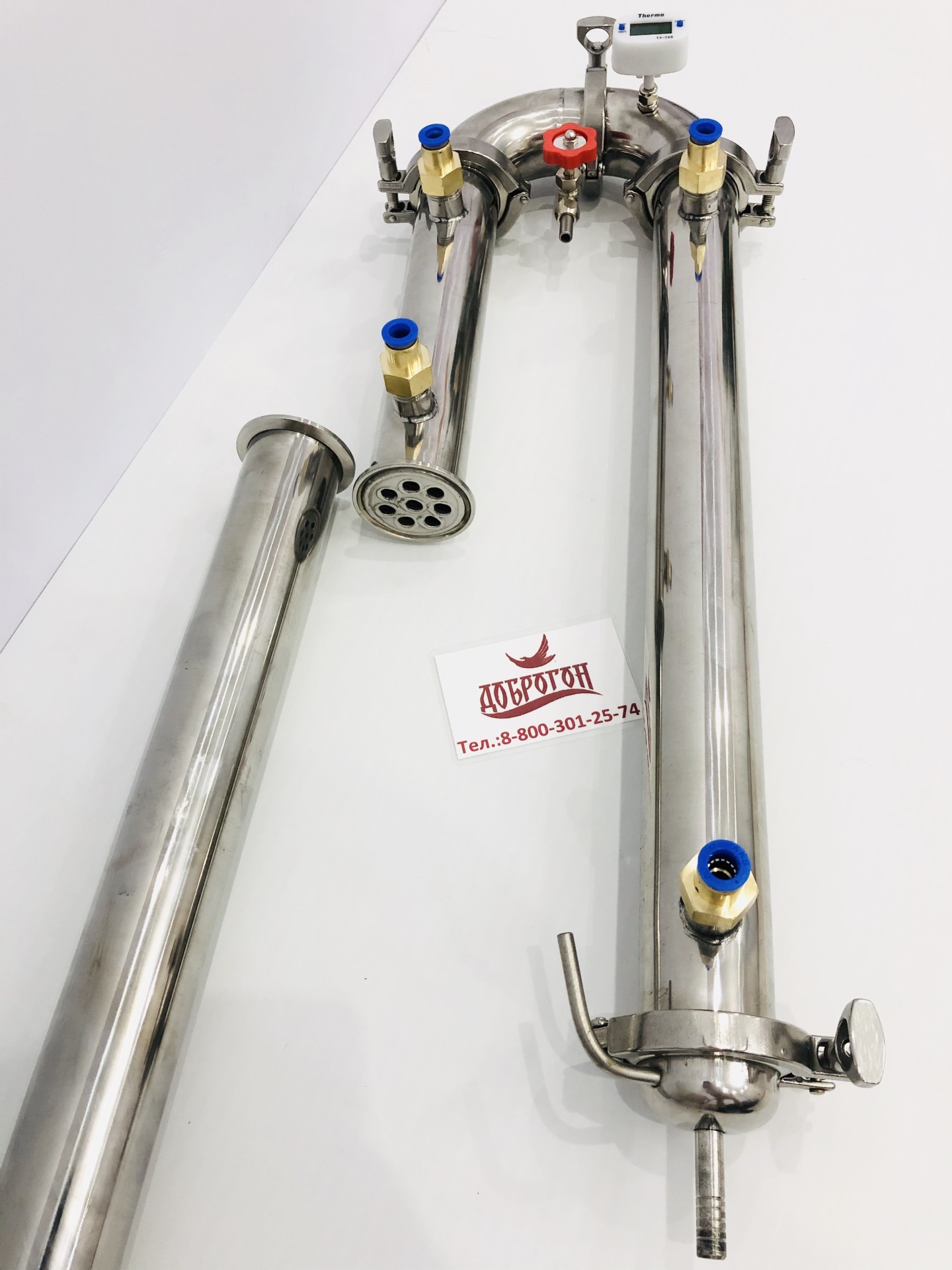Холодильник - кожехотрубный 400мм с 5-ю перегородками для равномерного охлаждения, внутри 8 трубок ф10мм; такой мощный холодильник способен утилизировать мощность до 5 кВт - при прямой дистилляции и до 3.5 кВт при ректификации с паровым отбором.