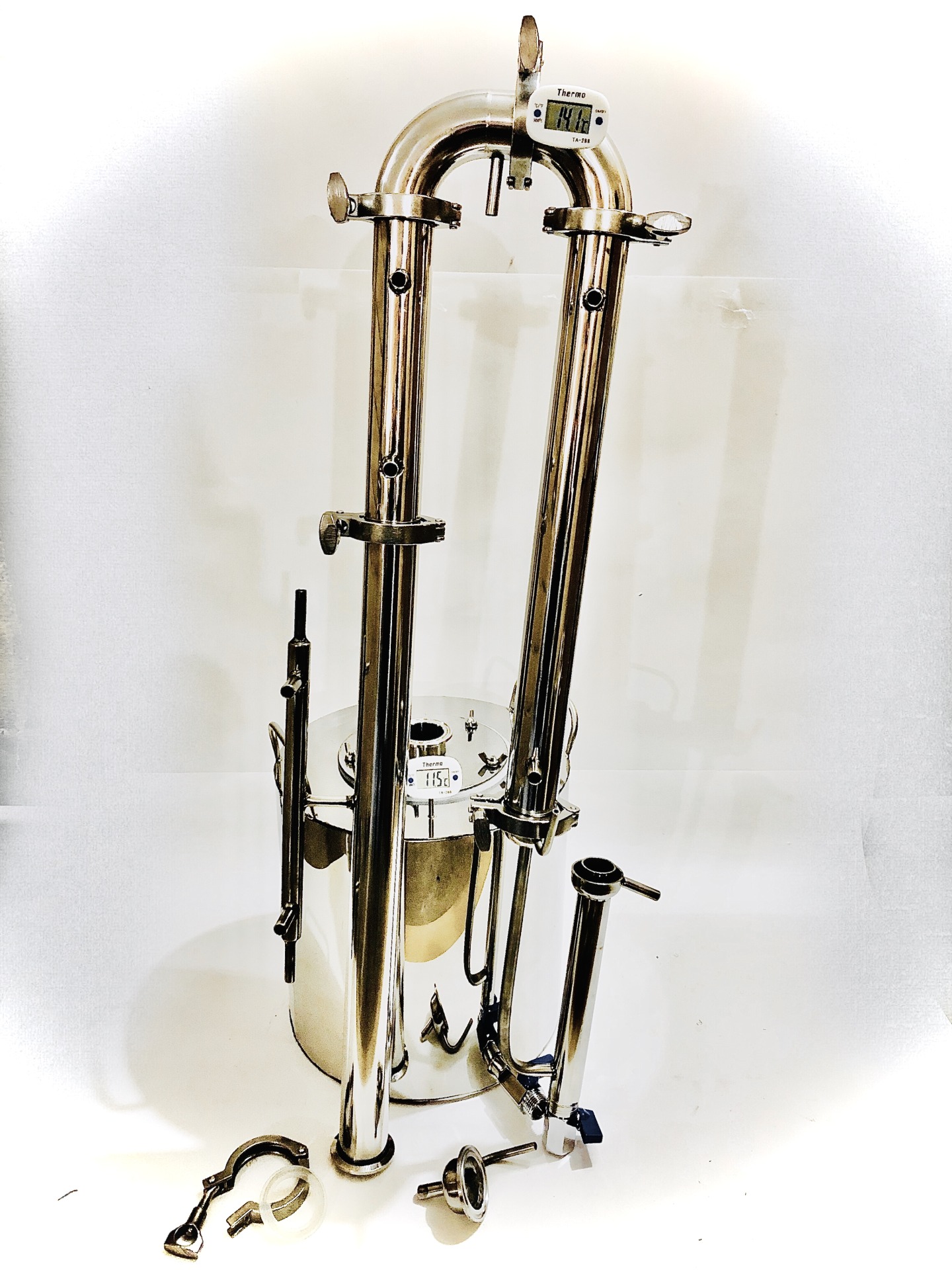 2) Колонна в сборе (царга 50см с Доохладителем(для режима ректификации); дефлегматор 20см; холодильник 40см; угол с узлом отбора; угол с гильзой под термометр; носик со связью с атмосферой; попугай (УНК) с сливным краном; 6шт хомутов ф51мм; 6шт силиконовых прокладок ф51мм; электронный термометр; РПН сетка Паченкова по 90см НЕРЖ. - 3шт.).