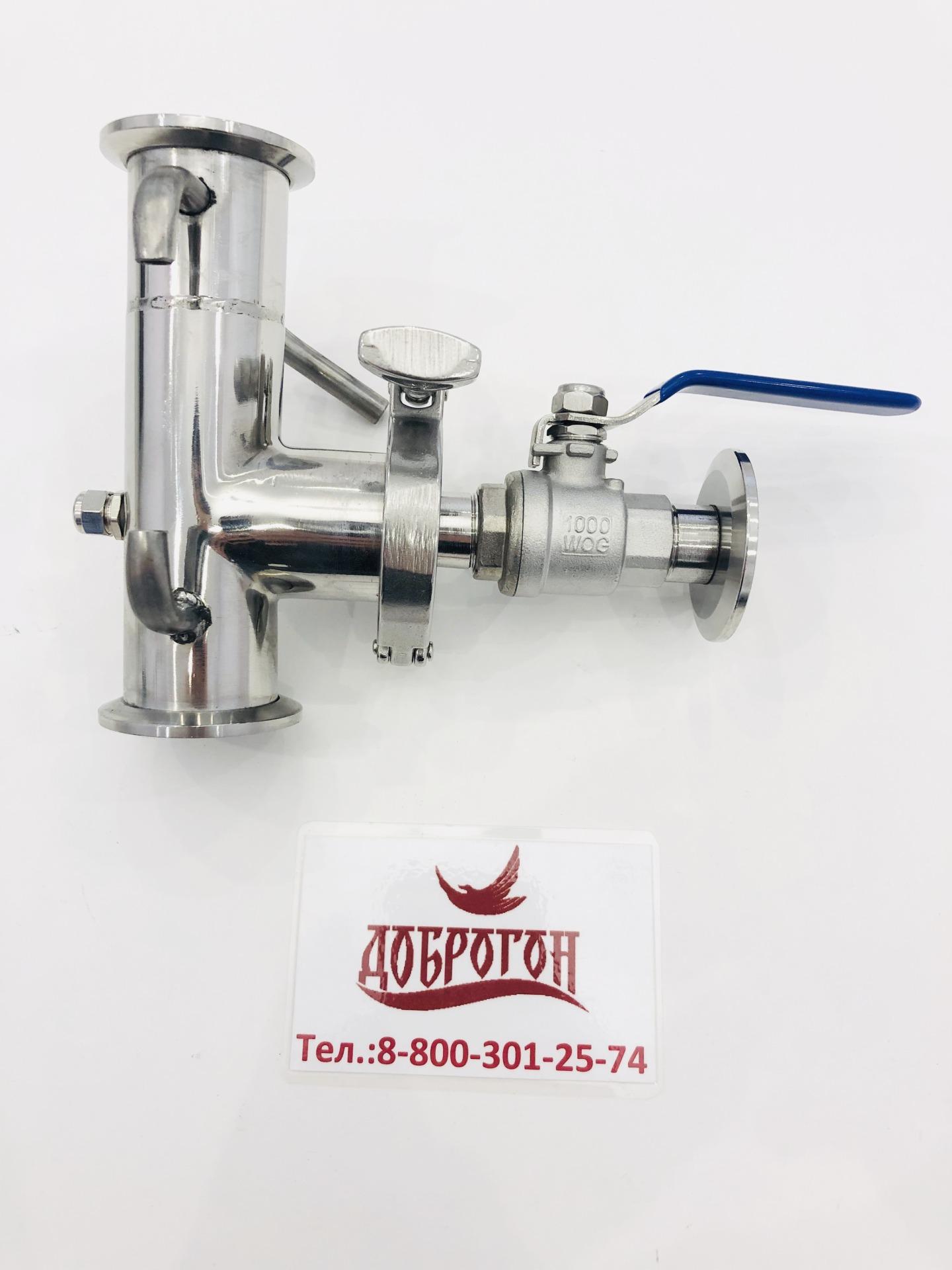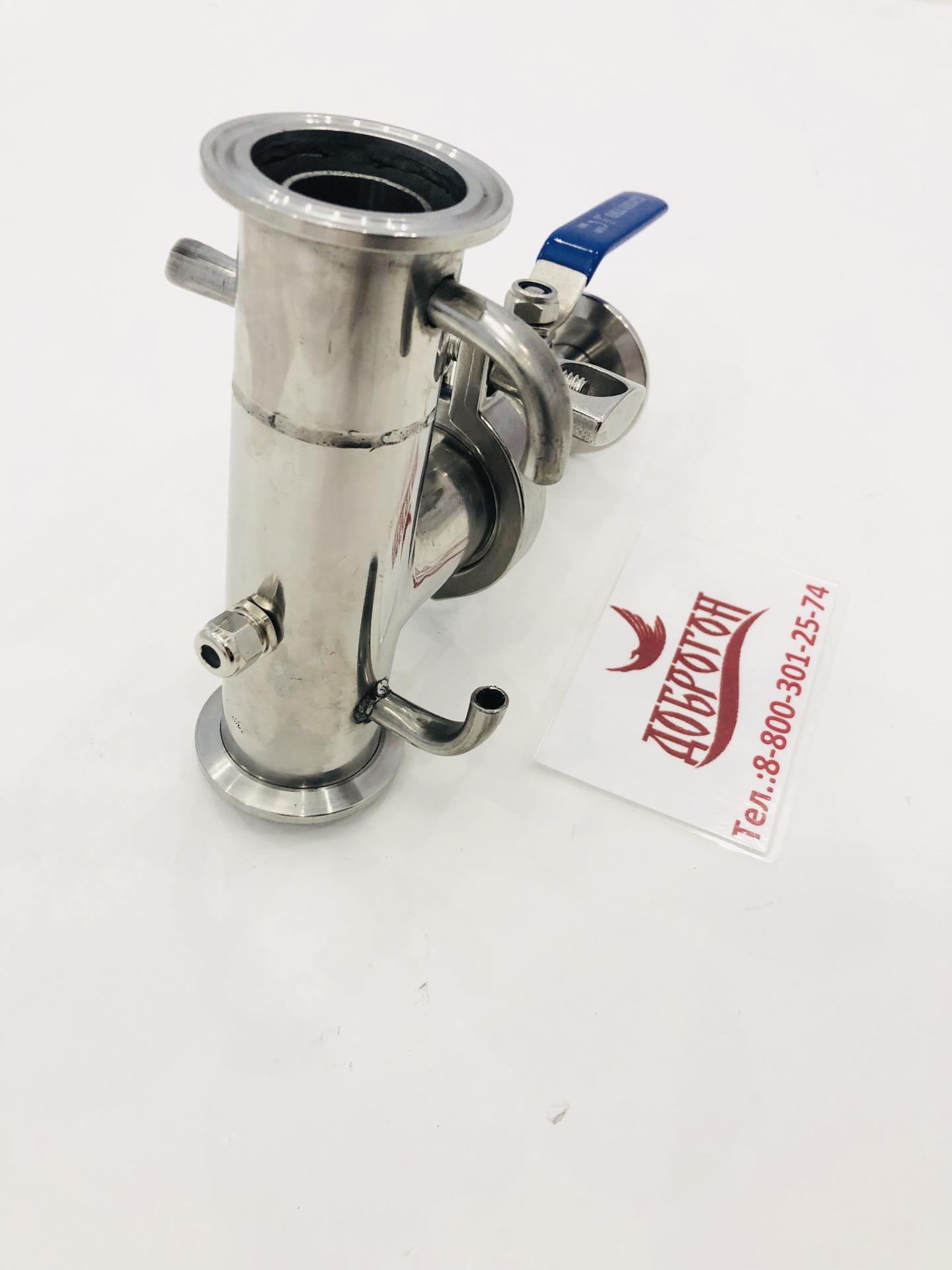 Узел отбора по пару и жидкости 1.5 Дюйма 38мм с гильзой под термометр (гильза зажимная) и трубкой перелива для контроля. В верхней части встроен узел отбора по жидкости (трубка отбора продукта 8мм). Отвод для парового отбора по пару под кламп 1.5 Дюйма (38мм) - (далее) - фланец 1.5 Дюйма (38мм) с резьбой G1/2 с хомутом и прокладкой - (далее) - шаровый кран нерж. 1/2 для регулировки отбора - (далее) - фланец 1.5 Дюйма (38мм) с резьбой G1/2. Высота в сборе - 15см.