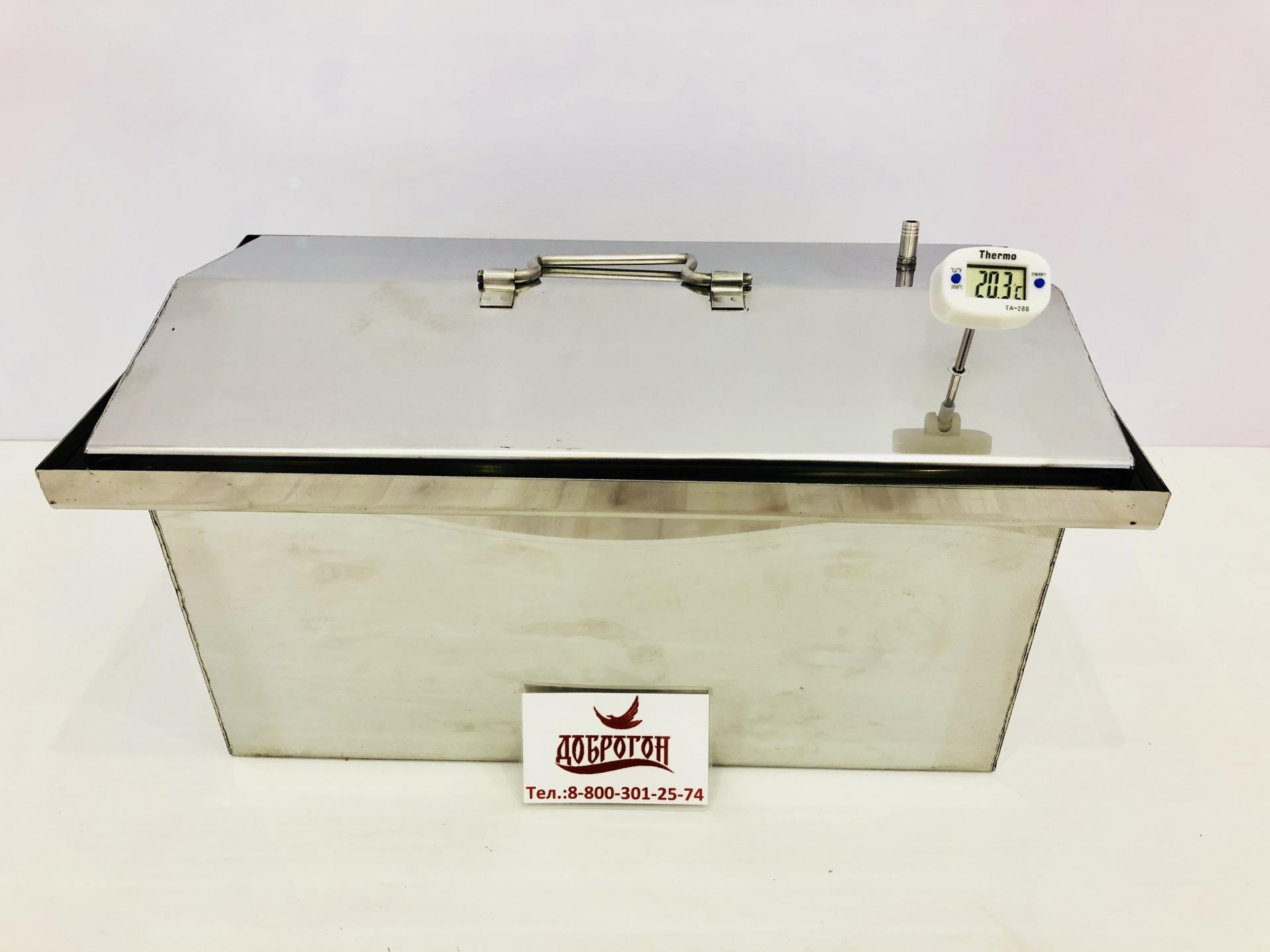 Коптильня оснащены сьёмным электронным термометром - для контроля температуры копчения, так как в некоторых случаях копчения определенных продутов нужно соблюдать процесс термообработки. Так же допустимо эксплуатация без термометра, так как гильза гермитина заглушена изнутри.