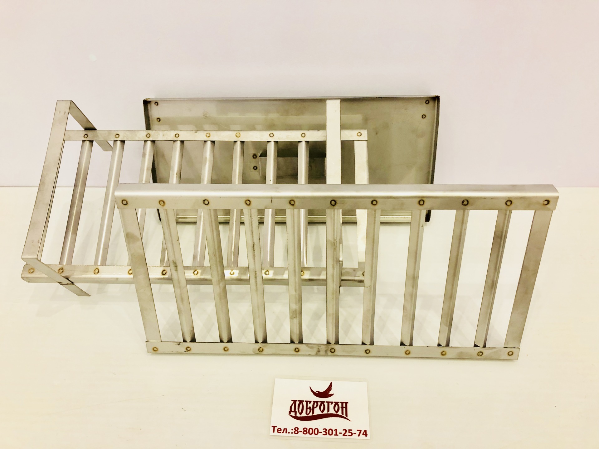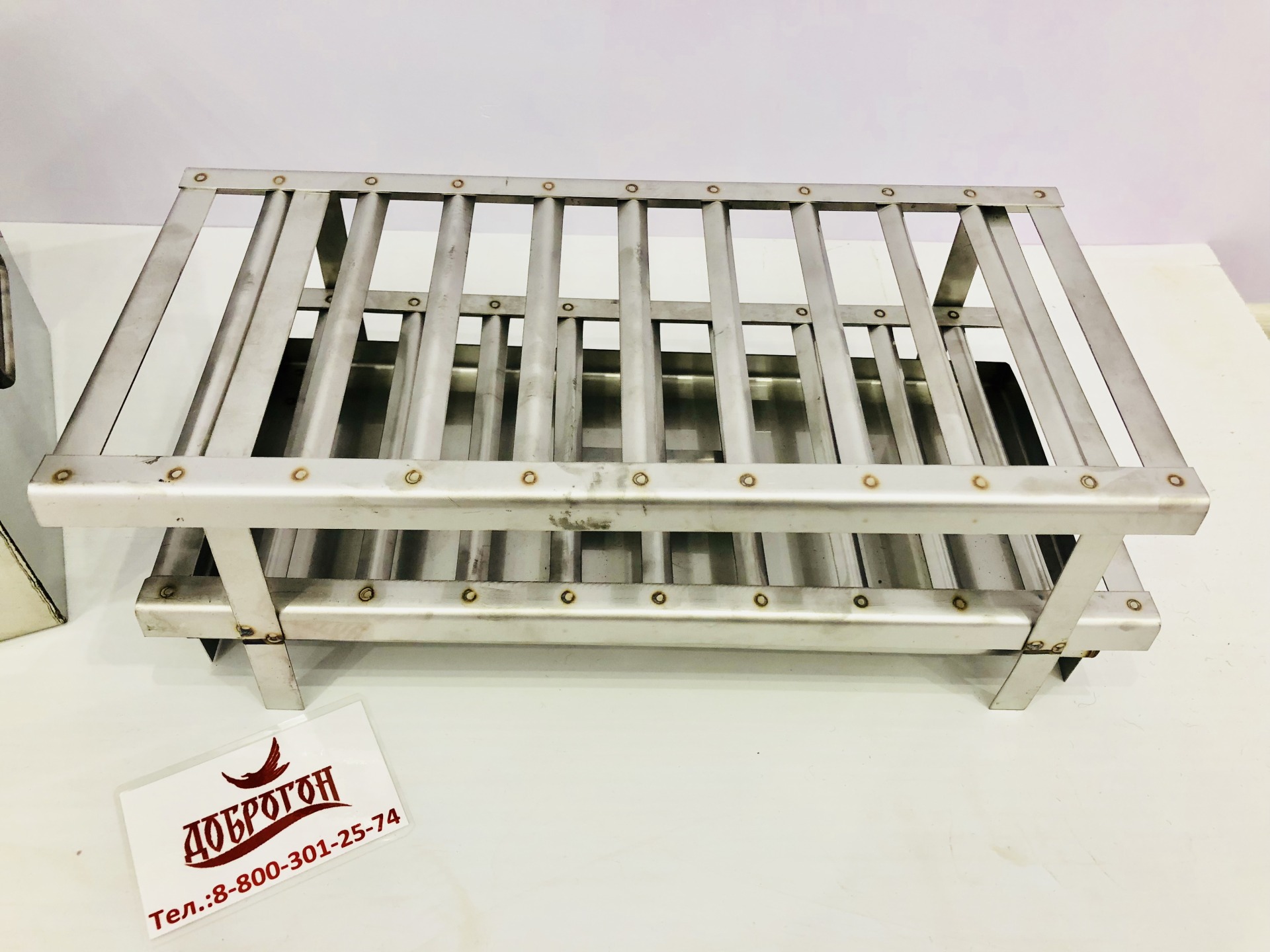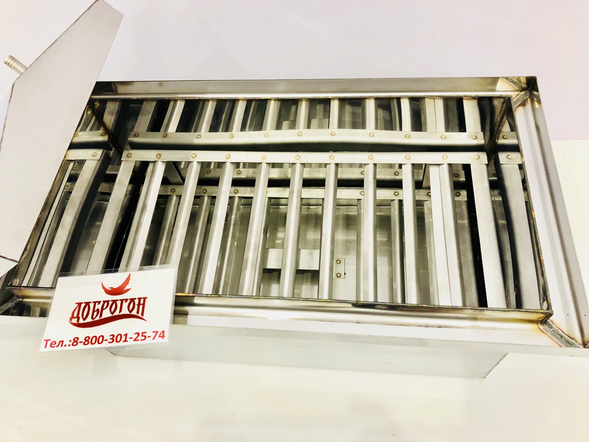 Коптильни от ТМ Доброгон выполнены из нержавеющей стали марки AISI 430 толщиной 1.5мм. Коптильня имеет два яруса для расположения продукта и так же поддон для сбора жира - выполненые из пищевой нержавеющей стали марки AISI 304.