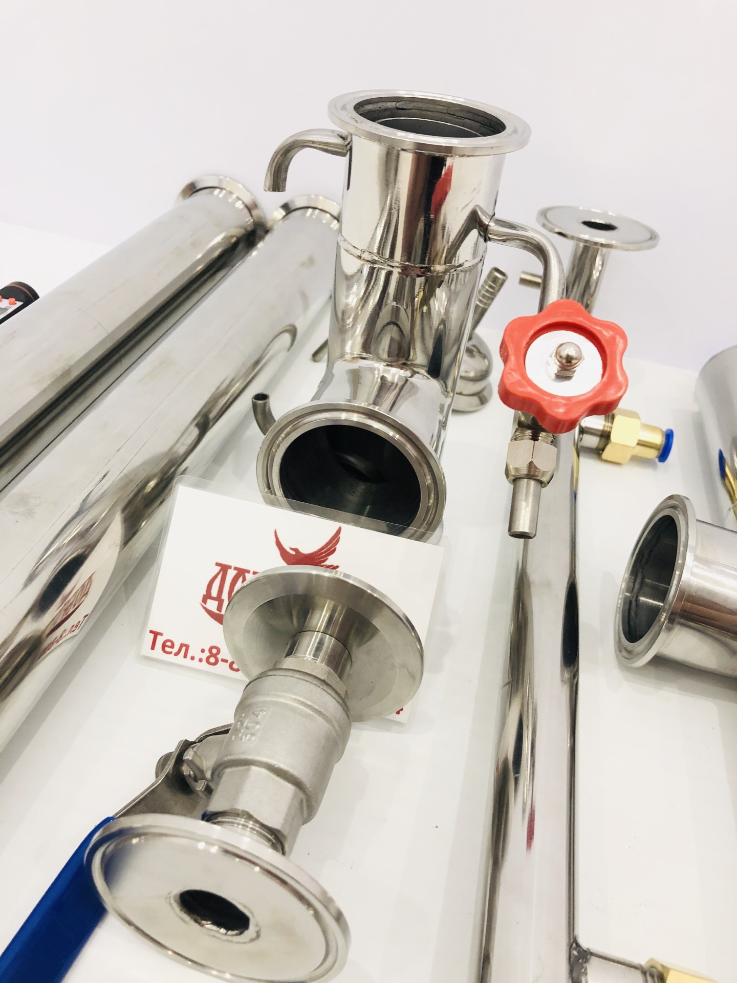 - Узел отбора по Пару и Жидкости 2 Дюйма (51мм) в сборе (игольчатый кран обжимной 8мм - 1шт; переходник с клампа 2 Дюйма на Резьбу G1/2 - 2шт; кран шаровый G1/2 нерж. - 1шт) - 1шт