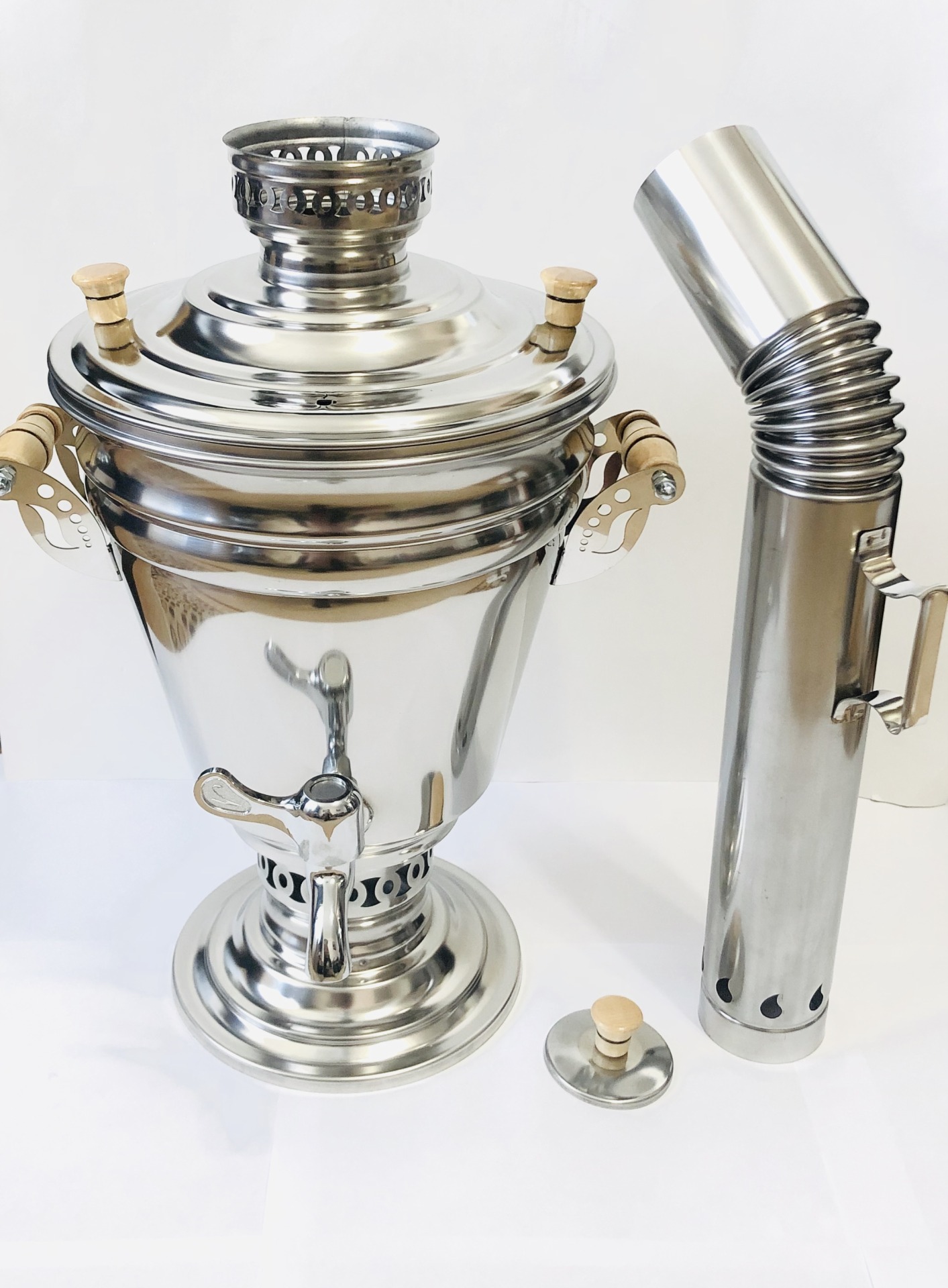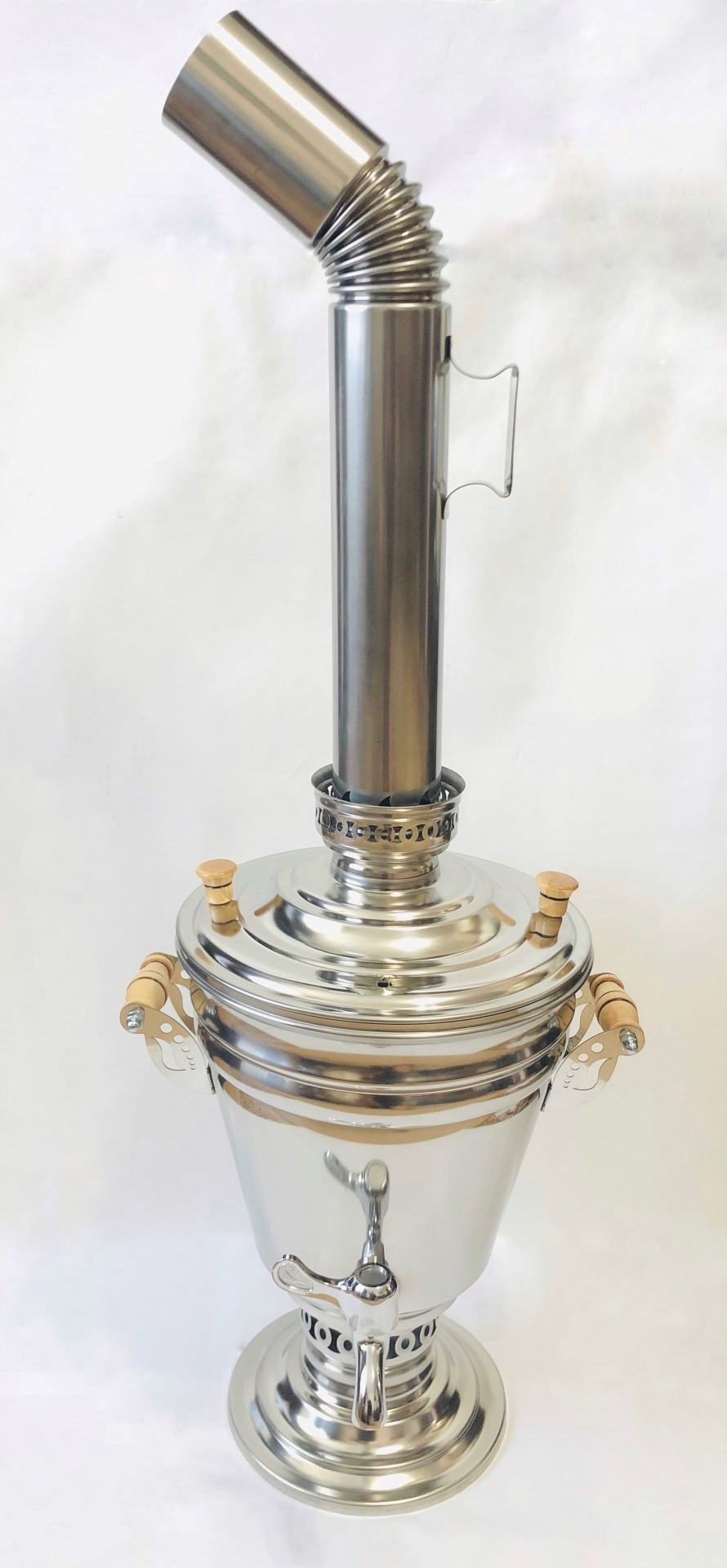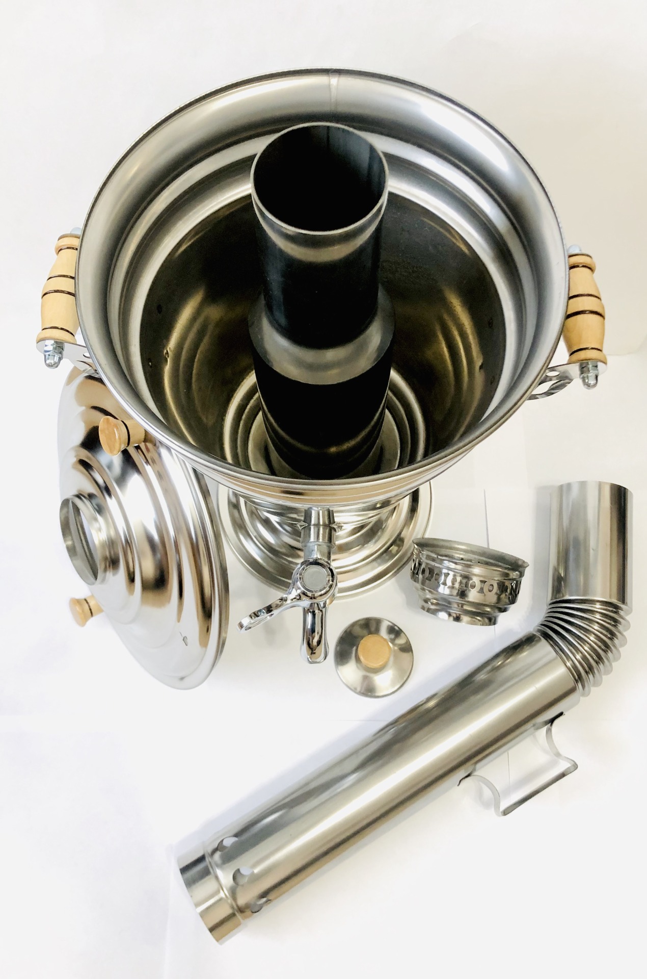 Данный самовар полностью изготовлен в России из высококачественной нержавеющей стали 12х18н10т (Aisi 304) толщина топки 1.5 мм, толщина корпуса 1 мм.