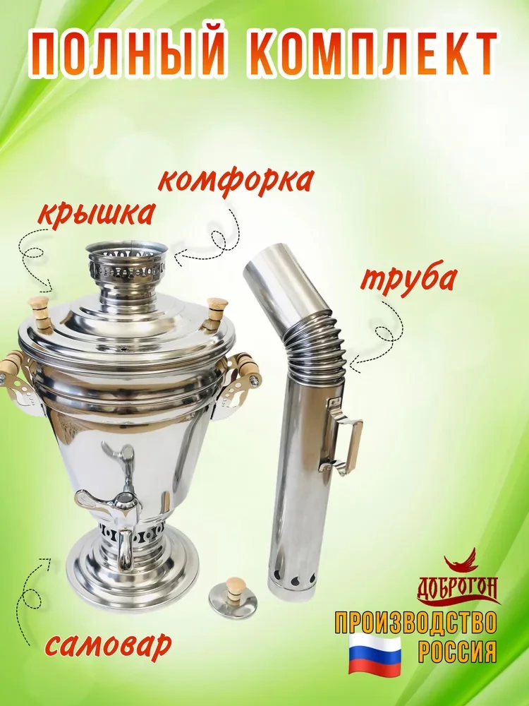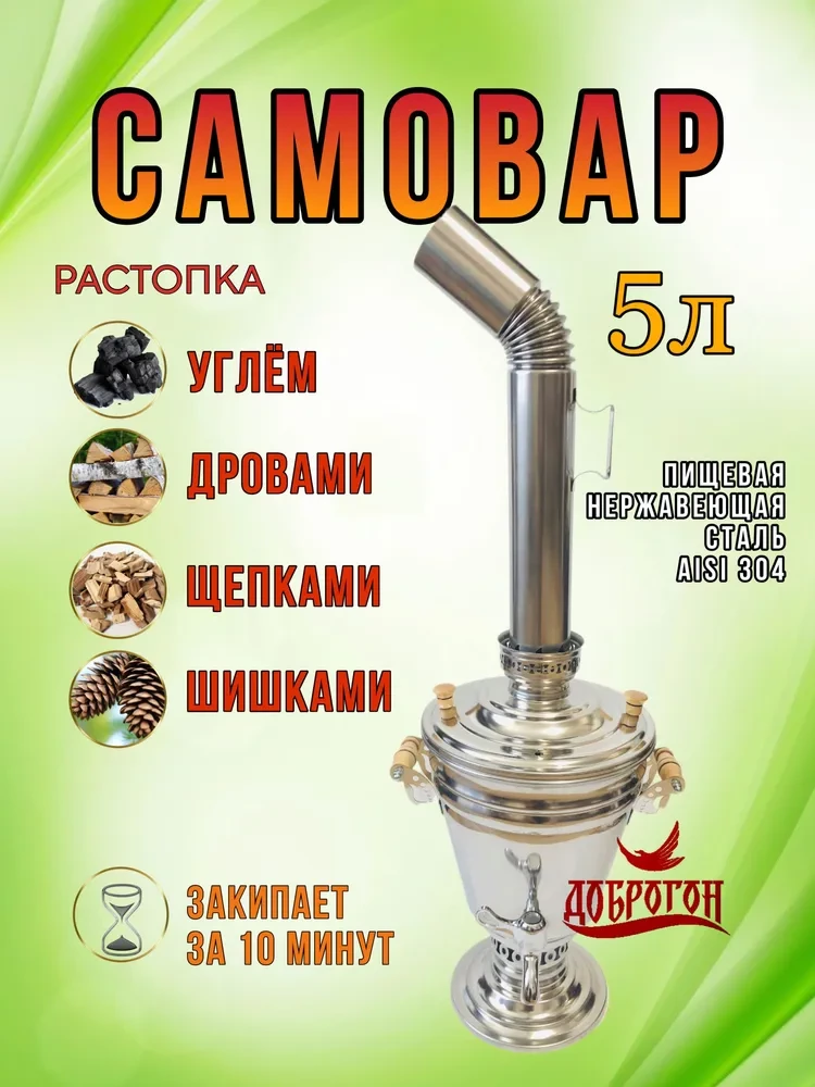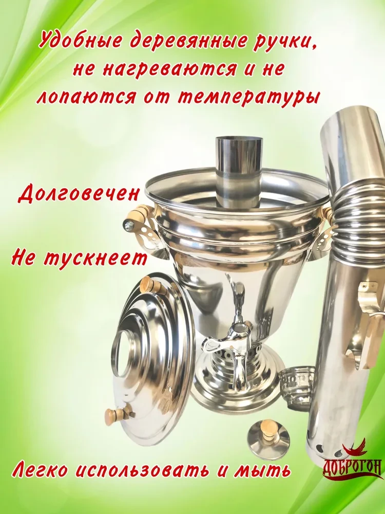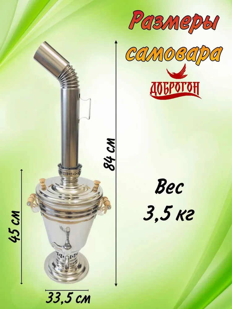 Данный самовар полностью изготовлен в России из высококачественной нержавеющей стали 12х18н10т (Aisi 304) толщина топки 1.5 мм, толщина корпуса 1 мм.