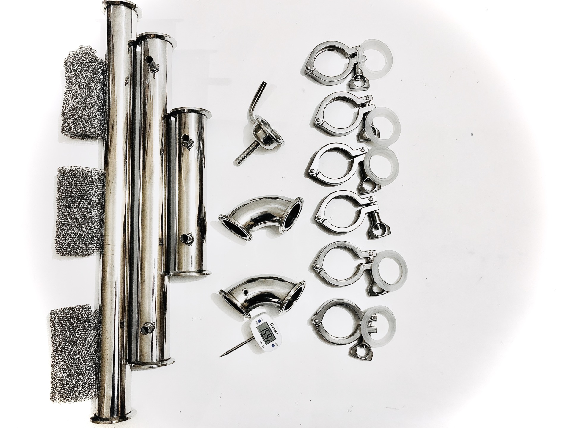 2) Колонна в сборе (царга 50см); дефлегматор 20см; холодильник 40см; угол; угол с гильзой под термометр; носик со связью с атмосферой; 6шт хомутов ф51мм ; 6шт силиконовых прокладок ф51мм; электронный термометр; РПН сетка Паченкова по 90см НЕРЖ. - 3шт.).